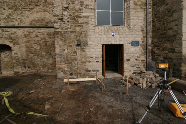 Die Pflasterarbeiten im Eingangs- und Hofbereich neben der Propstei haben begonnen. Der Aufwand hierfür ist größer als ursprünglich geplant. Unter dem Hofbereich befindet sich ein Kellergewölbe des ehemaligen Haus Mannebach. Aus Sicherheitsgründen wird nun über dem gesamten Kellerbereich eine Betondecke eingebracht bevor darauf mit den Pflasterarbeiten begonnen werden kann.